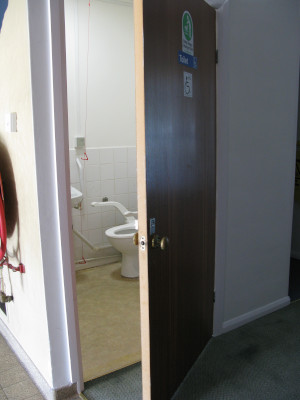 Please be aware that the doors between the main hall and the toilets are heavy and not automatic. A resolution will be sought but is not in place currently.