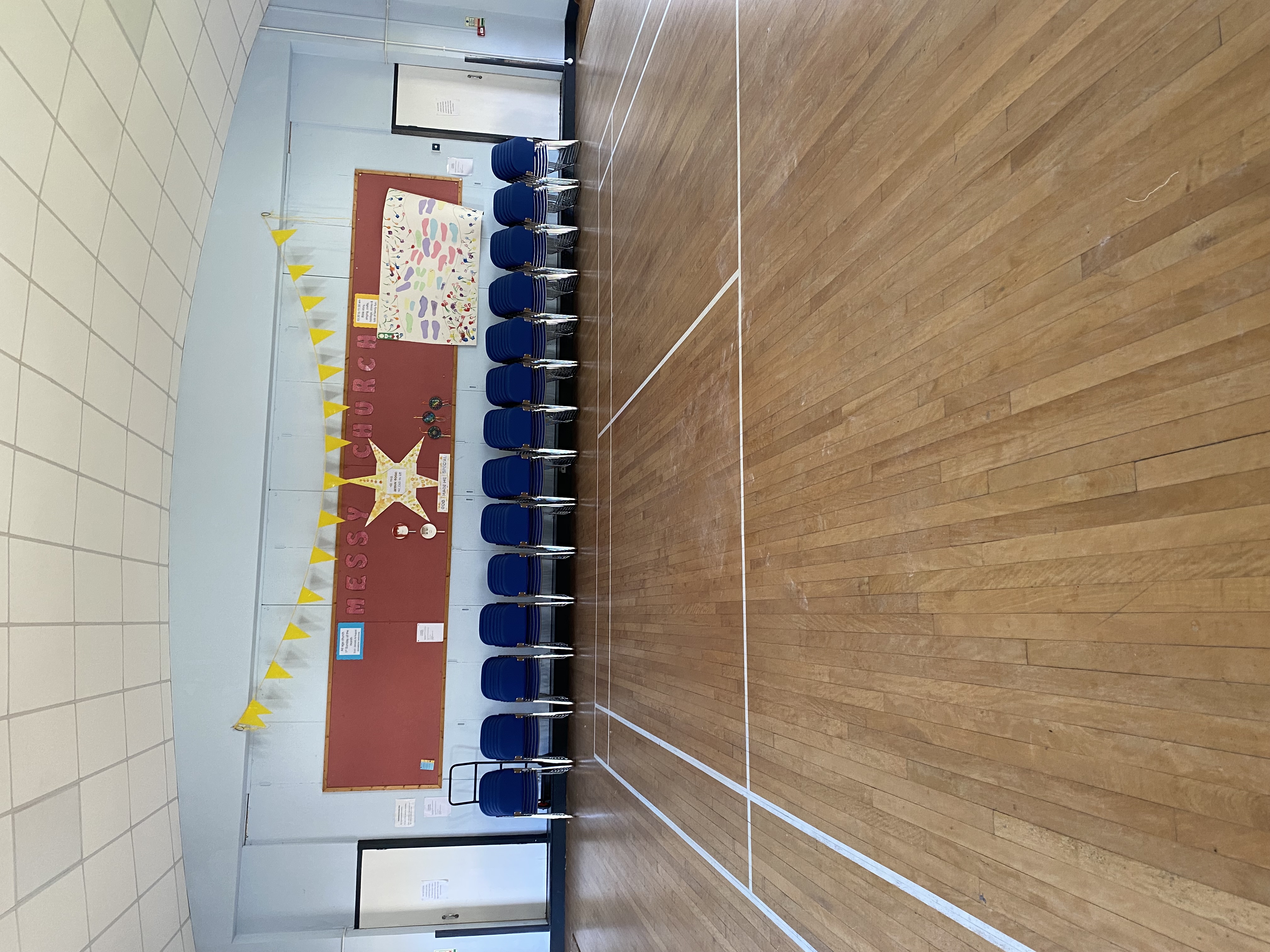 The Hall has a stage and sprung floor and is marked out for a Badminton court.